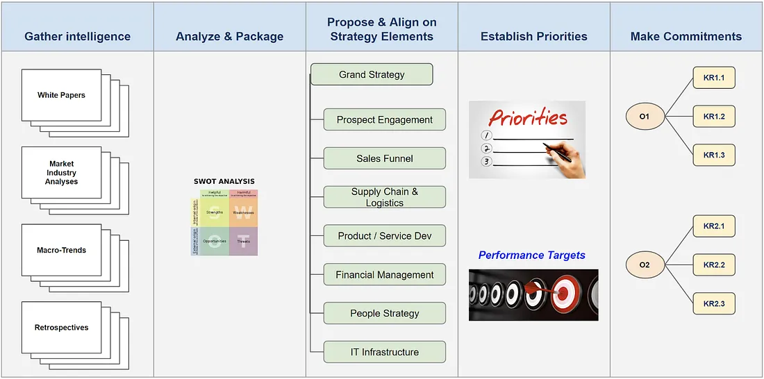 Organizational success and priorities are fostered by its strategic direction. Effectively setting that direction is the highest priority of the S&O. After all, it is in the name. I summarized how to develop a robust strategy and its key components in my article, “Crafting a Living Strategy”. If you want to read about what makes a good strategy I highly recommend reading that article. Here we will focus on the tactics of facilitating the creation or refresh.