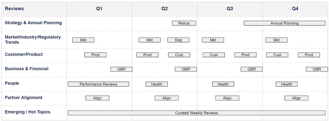 Rhythm of Business Cadence — With that set of efforts identified, we now need to schedule all of these efforts in a way that keeps organization leadership updated with the freshest available intelligence. The schedule below is a mock rhythm of business cadence.